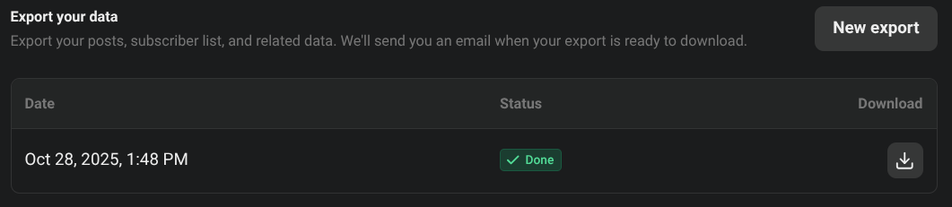 Just hit ‘New export’ and Substack will begin downloading. Once downloaded, you’ll receive an email from Substack and it will show as ‘Done’ in the export section.