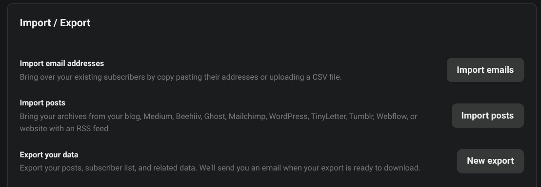Once in this setting, you’ll see three options. Importing email addresses and posts allows you to move those things to Substack, while exporting lets you take everything away.