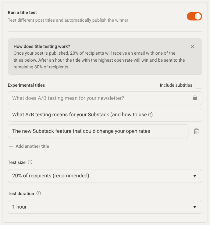 You can test four different options on anything from 5-50% of your subscribers, and after the test duration Substack will automatically send the post to everyone else on your list, changing the title to whichever option performed the best.